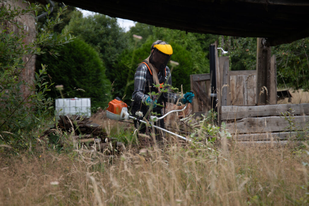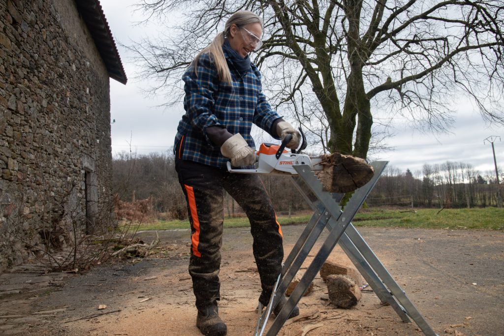 Zo’n zaag is zwaar en hem aan krijgen is nog zwaarder. Dan optillen om te zagen, soms omdraaien om vanuit een bepaalde hoek te zagen en ondertussen opletten dat je jezelf niet doorzaagt. Dus rem erop terwijl je jezelf of de zaag verplaatst en vooral niet met de bovenkant van de punt zagen om een “kick-back” (de zaag springt omhoog en met een beetje pech tegen je aan) te voorkomen. Oh ja, ook nog denken aan doppen op je oren voordat je de zaag aanzet en kap voor je gezicht voor je gaat zagen. En heel hard “hout!” roepen als je een boom gaat omzagen, zodat je mede-zagers niet onder de vallende boom terecht komen.