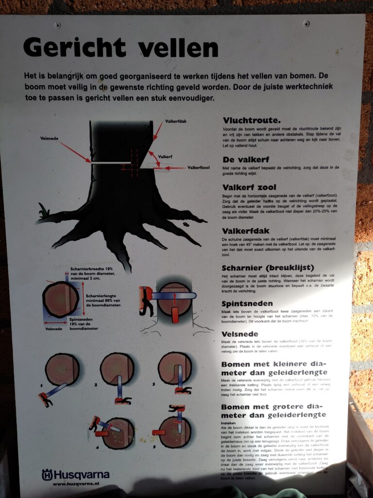 En dan heb ik het nog niet eens over de gebruiksaanwijzing voor het omzagen van een boom. Kijken waar hij moet vallen, valkerf zagen, spintsnedes maken, afzagen, maar niet helemaal tot de valkerf omdat er een scharnier moet blijven staan. Mocht de boom toch tegen een andere boom aan vallen, dan tijd voor plan B. Bijvoorbeeld het scharnier toch voor het grootste deel loszagen en dan de boom draaien met de velhevel. Geen dagelijkse kost voor een HR-adviseur en dan ook nog een die wat angstig is aangelegd. Maar… Ik heb het gedaan!!!