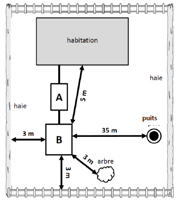 Hieronder een mooi schemaatje uit de handleiding van de SPANC. “Habitation” is het huis, A is de tank en B is het uitvloeiveld. Zoals je kunt zien, gelden er allerlei minimum afstanden. Tot bomen, tot waterpunten, tot buren. De minimum afstand van het afvloeiveld tot de waterput is één van de redenen dat het huidige systeem “non conforme” is.