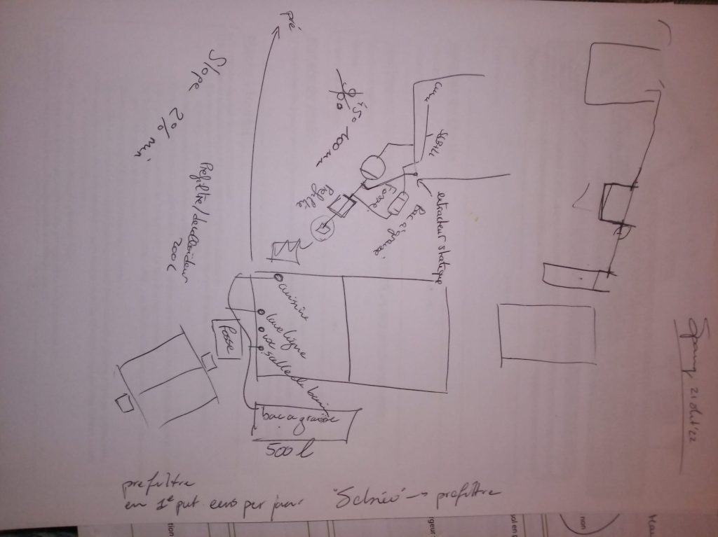 Graven dus eerst. Kijken hoe de leidingen precies lopen. Dan een “bac a graisse” (vetfilter) en een “prefiltre” kopen en ingraven. Daar moet de afvoer van de keuken, de wasmachine en de douche doorheen. De fosse hoeft dan alleen de afvoer van de WC te verwerken, waardoor het niet meer erg is dat hij maar 1 m3 is. En uiteindelijk komt alles dan in het uitvloeiveld dat er al ligt. Relatief eenvoudige en goedkope oplossing. Daarbij is het gelukkig niet erg is dat de fosse dichtbij de put ligt, omdat we het water uit de put niet als drinkwater gebruiken.